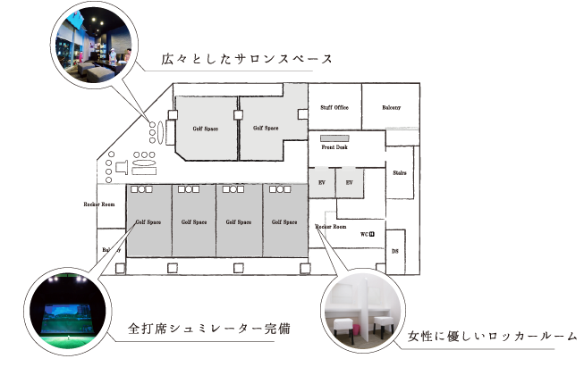全打席に最新のシュミレーターを設置し、「レッスン」「打ちっ放し」「18Hラウンド」を楽しめます。